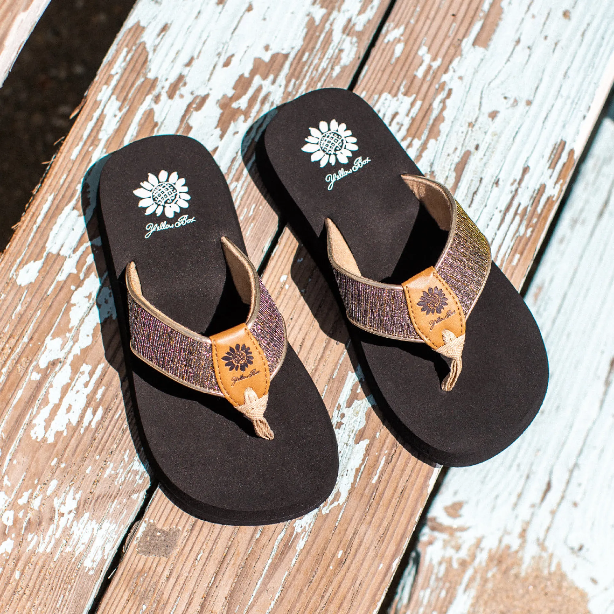 Stay Easy Breezy In These Delicately Shimmered Straps.1″ Heel Height0.75″ Platform HeightFaux Leather UpperSignature Yel…